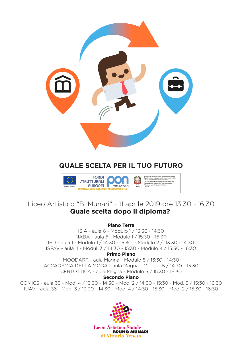 L’attività proposta si pone all’attenzione di chi frequenta il “Munari” quale momento di approfondimento di alcune delle possibilità di studio e percorsi formativi da poter scegliere dopo il diploma, e di presentare e far conoscere agli studenti le diverse proposte offerte dall’università, scuole del progetto e Accademie, il loro metodo di studio, le modalità d’iscrizione – costi, possibilità di accedere alle borse di studio, e di informare su attività in programma come work shop estivi e open day, stage e possibilità d’inserimento lavorativo.