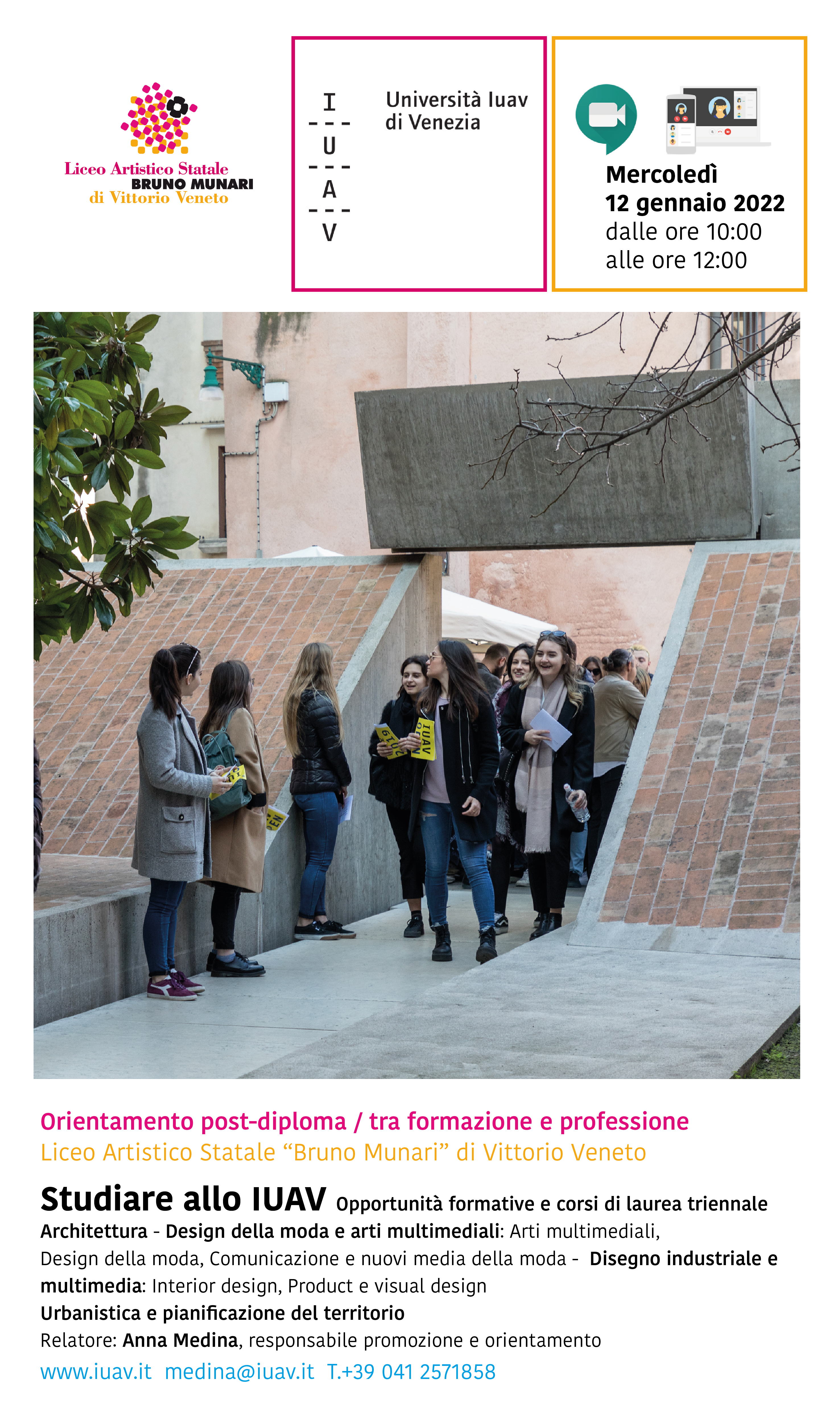 L’incontro si propone di presentare agli studenti delle classi V sulle possibilità di studio e i corsi di laurea triennale dello IUAV,
